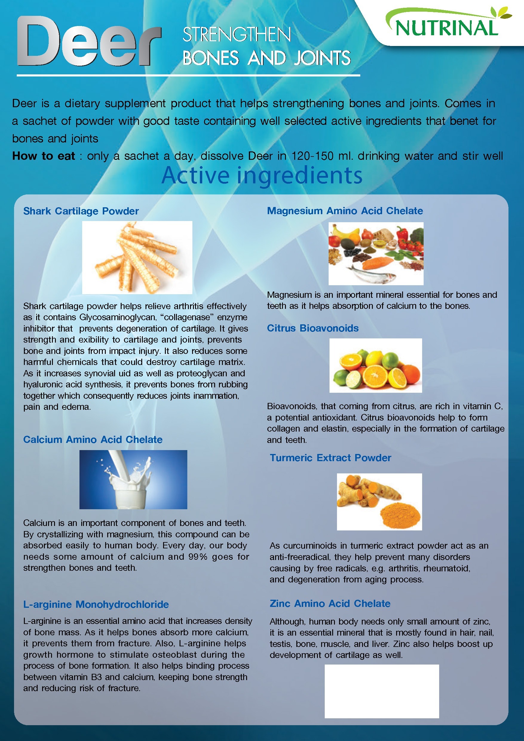 Deer is a dietary supplement product that helps strengthening bones and joints. Comes in a sachet of powder with good taste containing well selected active ingredients that benefit for bones and joints