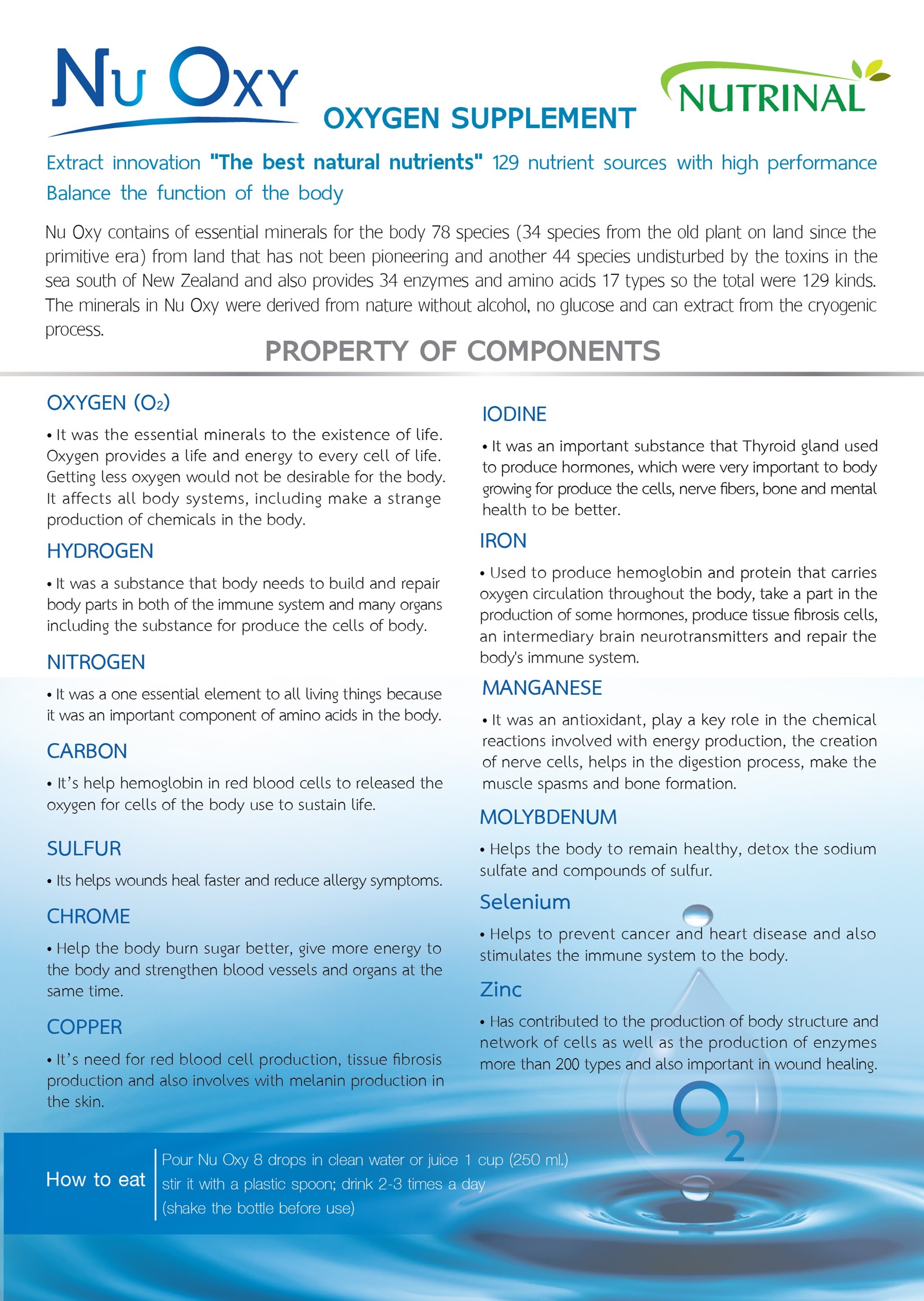 Nu Oxy contains of essential minerals for the body 78 species (34 species from the old plant on land since the primitive era) from land that has not been pioneering and another 44 species undisturbed by the toxins in the sea south of New Zealand and also provides 34 enzymes and amino acids 17 types so the total were 129 kinds. The minerals in Nu Oxy were derived from nature without alcohol, no glucose and can extract from the cryogenic process.
