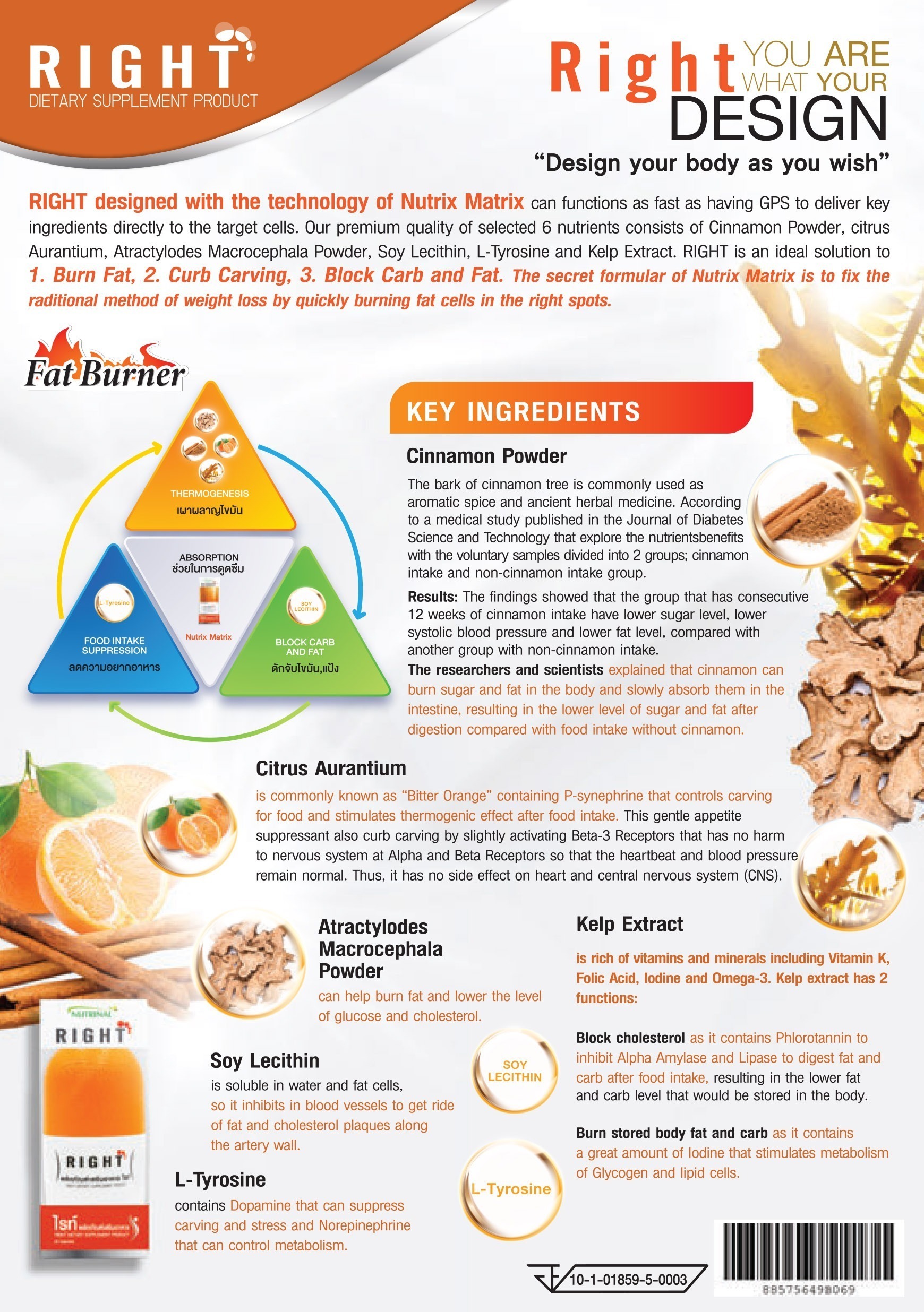 RIGHT designed with the technology of Nutrix Matrix can functions as fast as having GPS to deliver key ingredients directly to the target cells. Our premium quality of selected 6 nutrients consists of Cinnamon Powder, Citrus Aurantium, Atractylodes Macrocephala Powder, Soy Lecithin, L-Tyrosine and Kelp Extract. RIGHT is an ideal solution to 1. Burn Fat, 2. Curb Craving, 3. Block Carb and Fat. The secret formular of Nutrix Matrix is to fix the traditional method of weight loss by quickly burning fat cells in the right spots.