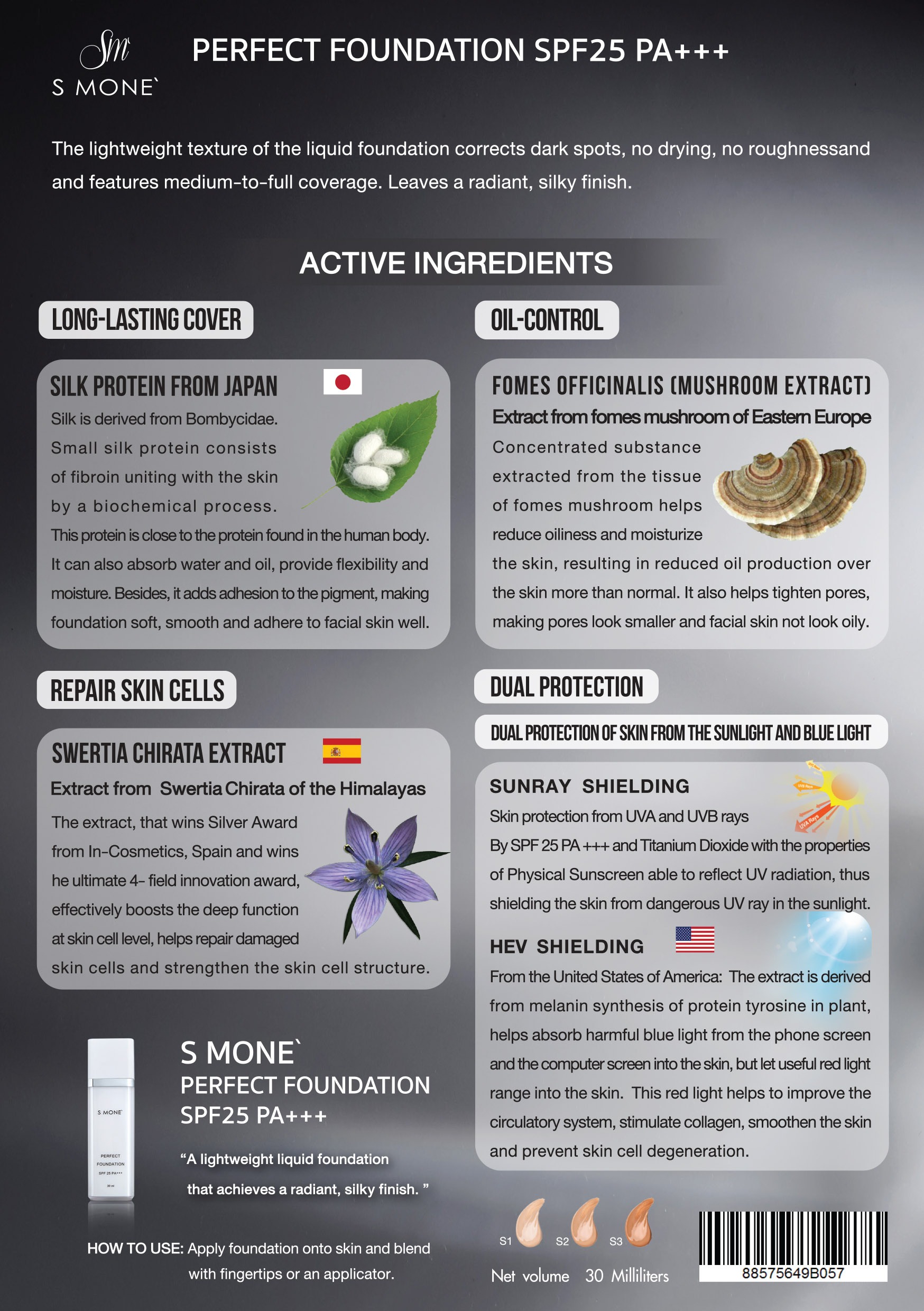 The lightweight texture of the liquid foundation corrects dark spots, no drying, no roughness and features medium-to-full coverage. Leaves a radiant, silky finish.